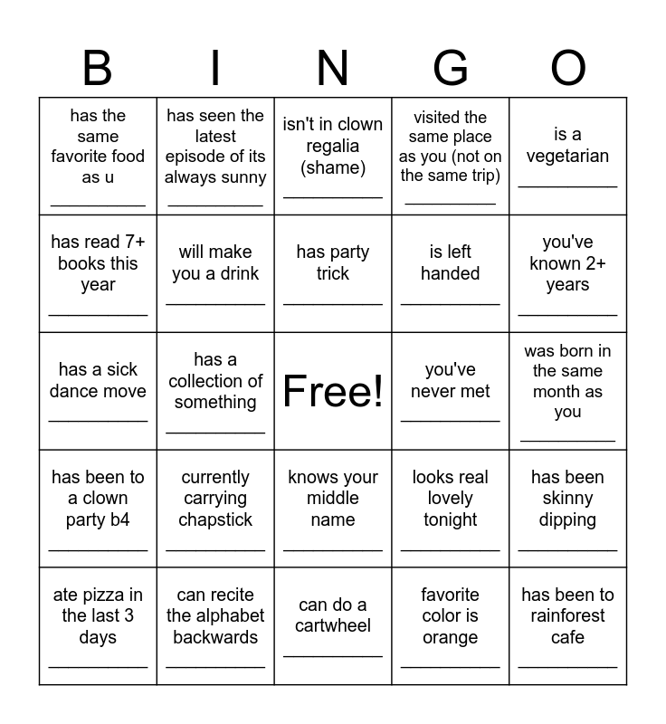 This bingo card has a free space and 34 words: knows most of "In the End" by Linkin Park (with proof) __________, favorite color is orange __________, lives in a different state than you __________, really likes a lot of orange chicken __________, has been to a clown party b4 __________, will make you a drink __________, is a vegetarian __________, ate pizza in the last 3 days __________, has seen the latest episode of its always sunny __________, knows this song __________, has party trick __________, isn't in clown regalia (shame) __________, will let you honk their nose __________, enjoys cream pies (any) __________, you've never met __________, you've known 2+ years __________, can recite the alphabet backwards __________, has a sick dance move __________, currently carrying chapstick __________, looks real lovely tonight __________, knows your middle name __________, almost died __________, has the same favorite food as u __________, was born in the same month as you __________, can do a cartwheel __________, has been to rainforest cafe __________, visited the same place as you (not on the same trip) __________, DOESN'T drink coffee __________, is left handed __________, has read 7+ books this year __________, has slept outside (no tent) __________, has a collection of something __________, has been skinny dipping __________ and can juggle (with proof) __________.