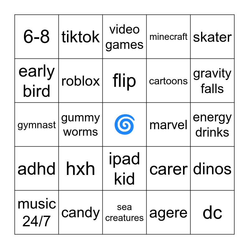 This bingo card has a free space and 24 words: hxh, candy, flip, music 24/7, skater, 6-8, early bird, tiktok, marvel, ipad kid, cartoons, gymnast, carer, dinos, roblox, agere, energy drinks, video games, gravity falls, gummy worms, dc, adhd, minecraft and sea creatures.