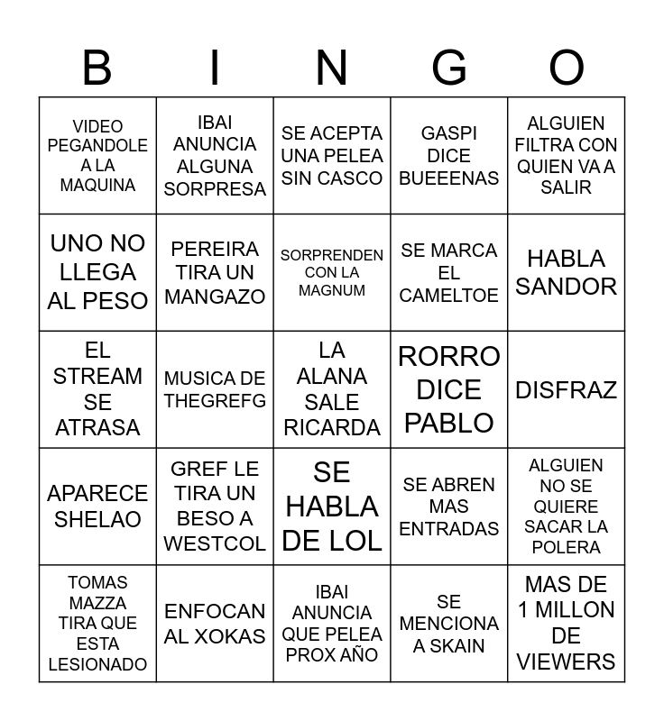 This bingo card has a free space and 24 words: GREF LE TIRA UN BESO A WESTCOL, ENFOCAN AL XOKAS, SORPRENDEN CON LA MAGNUM, TOMAS MAZZA TIRA QUE ESTA LESIONADO, ALGUIEN FILTRA CON QUIEN VA A SALIR, VIDEO PEGANDOLE A LA MAQUINA, UNO NO LLEGA AL PESO, IBAI ANUNCIA ALGUNA SORPRESA, RORRO DICE PABLO, SE HABLA DE LOL, SE MARCA EL CAMELTOE, EL STREAM SE ATRASA, SE ABREN MAS ENTRADAS, ALGUIEN NO SE QUIERE SACAR LA POLERA, PEREIRA TIRA UN MANGAZO, SE MENCIONA A SKAIN, DISFRAZ, SE ACEPTA UNA PELEA SIN CASCO, HABLA SANDOR, MUSICA DE THEGREFG, MAS DE 1 MILLON DE VIEWERS, APARECE SHELAO, GASPI DICE BUEEENAS and IBAI ANUNCIA QUE PELEA PROX AÑO.
