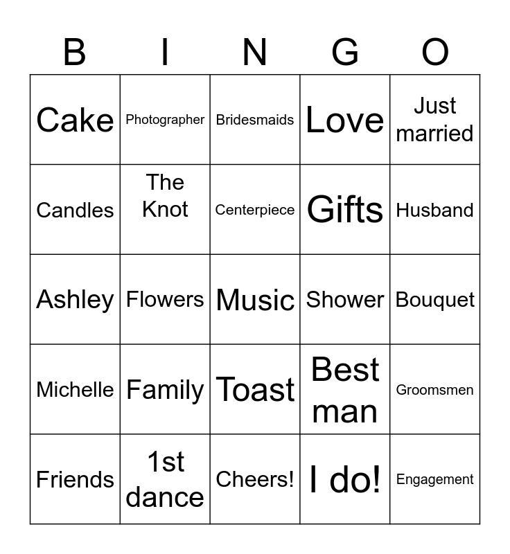 This bingo card has 70 words: RSVP, Bouquet, Tux, St Patrick's Church, 1st dance, Antonio, Love, Veil, Just married, Dan, Groomsmen, Ring, Cake, Bridesmaids, Vows, Flowers, Toast, Gifts, Mr & Mrs, Michelle, Shower, Best man, Husband, Groom, Wedding dress, Alter, Lauren, Churchill, I do!, I Love You, Photographer, Rehersal, Save the Date, Invitations, Jules, Wife, Kiss, Guests, Ceremony, Candles, Engagement, Family, Music, Maid of Honor, After Party, The Knot, Friends, OIT, Newlyweds, Rings, Boutonniere, Honeymoon, Aisle, Rebecca, Cheers!, Lily, Centerpiece, Evergreen, Cards, Corsage, Ashley, The Elks, Bride, Emily, "Shallow", Blessings, Videographer, Hannah, WNEU and Happily Ever After.