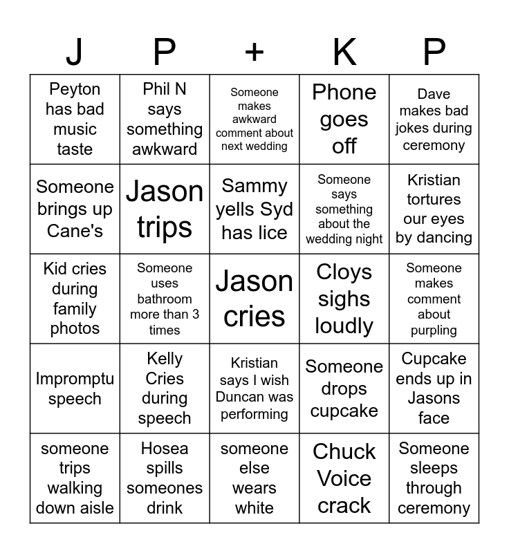 This bingo card has a free space and 24 words: Kelly Cries during speech, Hosea spills someones drink, Sammy yells Syd has lice, someone trips walking down aisle, Dave makes bad jokes during ceremony, Peyton has bad music taste, Someone brings up Cane's, Phil N says something awkward, Cloys sighs loudly, Kristian says I wish Duncan was performing, Someone says something about the wedding night, Kid cries during family photos, Someone drops cupcake, Cupcake ends up in Jasons face, Jason trips, Chuck Voice crack, Someone makes comment about purpling, Someone makes awkward comment about next wedding, Kristian tortures our eyes by dancing, Someone uses bathroom more than 3 times, Someone sleeps through ceremony, Impromptu speech, Phone goes off and someone else wears white.