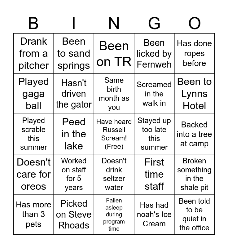This bingo card has a free space and 24 words: Worked on staff for 5 years, Picked on Steve Rhoads, Same birth month as you, Has more than 3 pets, Has done ropes before, Drank from a pitcher, Played gaga ball, Been to sand springs, Stayed up too late this summer, Doesn't drink seltzer water, Screamed in the walk in, Played scrable this summer, First time staff, Broken something in the shale pit, Hasn't driven the gator, Has had noah's Ice Cream, Backed into a tree at camp, Been on TR, Been to Lynns Hotel, Peed in the lake, Been told to be quiet in the office, Doesn't care for oreos, Been licked by Fernweh and Fallen asleep during program time.