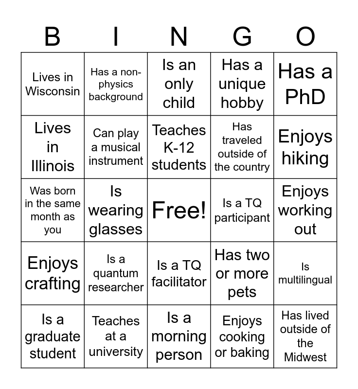 This bingo card has a free space and 24 words: Is a quantum researcher, Teaches at a university, Teaches K-12 students, Is a graduate student, Has a PhD, Lives in Wisconsin, Lives in Illinois, Has a non-physics background, Is a TQ participant, Is a TQ facilitator, Has traveled outside of the country, Was born in the same month as you, Has two or more pets, Is multilingual, Can play a musical instrument, Enjoys cooking or baking, Enjoys working out, Is an only child, Enjoys hiking, Is wearing glasses, Has lived outside of the Midwest, Enjoys crafting, Has a unique hobby and Is a morning person.