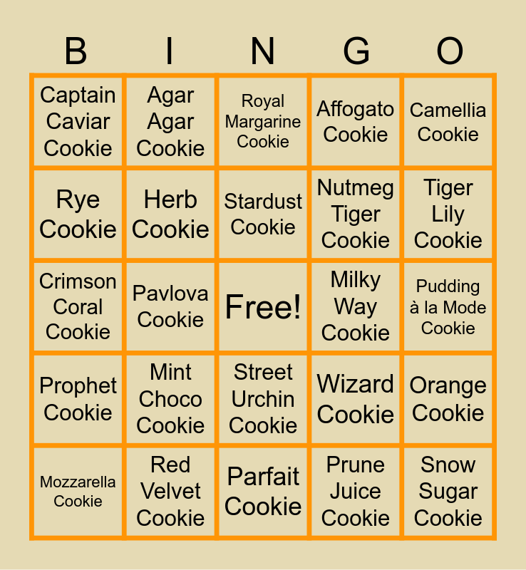 This bingo card has a free space and 148 words: GingerBrave, Strawberry Cookie, Ninja Cookie, Angel Cookie, Muscle Cookie, Wizard Cookie, Beet Cookie, Devil Cookie, Custard Cookie III, Clover Cookie, Carrot Cookie, Avocado Cookie, Pancake Cookie, Onion Cookie, Gumball Cookie, Blackberry Cookie, Adventurer Cookie, Alchemist Cookie, Cherry Cookie, Knight Cookie, Princess Cookie, Orange Cookie, Lemon Cookie, Cream Soda Cookie, Sugarfly Cookie, Pavlova Cookie, Agar Agar Cookie, Wedding Cake Cookie, Black Forest Cookie, Black Sapphire Cookie, Candy Apple Cookie, Okchun Cookie, Green Tea Mousse, Pudding à la Mode Cookie, Choco Drizzle Cookie, Red Osmanthus Cookie, Golden Osmanthus Cookie, Smoked Cheese Cookie, Nutmeg Tiger Cookie, Star Coral Cookie, Peach Blossom Cookie, Cloud Haetae Cookie, Street Urchin Cookie, Caramel Choux Cookie, Butter Roll Cookie, Matcha Cookie, Mercurial Knight Cookie, Silverbell Cookie, Rebel Cookie, Crème Brûlée Cookie, Linzer Cookie, Olive Cookie, Mozzarella Cookie, Fettuccine Cookie, Burnt Cheese Cookie, Frilled Jellyfish Cookie, Peppermint Cookie, Black Lemonade Cookie, Rockstar Cookie, Tarte Tatin Cookie, Royal Margarine Cookie, Kouign-Amann Cookie, Prune Juice Cookie, Space Doughnut, Blueberry Pie Cookie, Milky Way Cookie, Prophet Cookie, Pinecone Cookie, Carol Cookie, Macaron Cookie, Schwarzwälder, Candy Diver Cookie, Captain Caviar Cookie, Cream Unicorn Cookie, Financier Cookie, Crunchy Chip Cookie, Wildberry Cookie, Cherry Blossom Cookie, Caramel Arrow Cookie, Affogato Cookie, Tea Knight Cookie, Eclair Cookie, Cocoa Cookie, Cotton Cookie, Pumpkin Pie Cookie, Twizzly Gummy Cookie, Mala Sauce Cookie, Moon Rabbit Cookie, Raspberry Cookie, Parfait Cookie, Sorbet Shark Cookie, Squid Ink Cookie, Lilac Cookie, Mango Cookie, Red Velvet Cookie, Pastry Cookie, Fig Cookie, Strawberry Crepe Cookie, Black Raisin Cookie, Almond Cookie, Latte Cookie, Kumiho Cookie, Rye Cookie, Espresso Cookie, Madeleine Cookie, Licorice Cookie, Poison Mushroom Cookie, Milk Cookie, Purple Yam Cookie, Pomegranate Cookie, Chili Pepper Cookie, Sparkling Cookie, Dark Choco Cookie, Herb Cookie, Mint Choco Cookie, Werewolf Cookie, Tiger Lily Cookie, Vampire Cookie, Snow Sugar Cookie, Camellia Cookie, Elder Faerie Cookie, Crimson Coral Cookie, Shining Glitter Cookie, Capsaicin Cookie, Stardust Cookie, Sherbet Cookie, Oyster Cookie, Clotted Cream Cookie, Pitaya Dragon Cookie, Fire Spirit Cookie, Wind Archer Cookie, Stormbringer Cookie, Moonlight Cookie, Black Pearl Cookie, Frost Queen Cookie, Sea Fairy Cookie, Pure Vanilla Cookie, Hollyberry Cookie, Dark Cacao Cookie, Golden Cheese Cookie, White Lily Cookie, Mystic Flour Cookie, Burning Spice Cookie, Shadow Milk Cookie, Eternal Sugar Cookie, Lime Cookie, Jagae Cookie and Manju Cookie.
