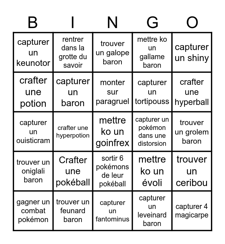 This bingo card has 25 words: Crafter une pokéball, capturer un fantominus, monter sur paragruel, gagner un combat pokémon, capturer un shiny, capturer un keunotor, crafter une potion, rentrer dans la grotte du savoir, capturer un pokémon dans une distorsion, sortir 6 pokémons de leur pokéball, capturer un tortipouss, capturer un ouisticram, mettre ko un évoli, trouver un ceribou, capturer un baron, capturer 4 magicarpe, trouver un grolem baron, trouver un galope baron, crafter une hyperball, crafter une hyperpotion, mettre ko un goinfrex, trouver un feunard baron, trouver un oniglali baron, mettre ko un gallame baron and capturer un leveinard baron.