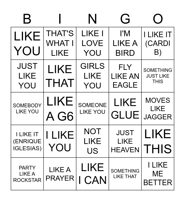 This bingo card has 30 words: LIKE A PRAYER, LIKE A STONE, LIKE A G6, LIKE A BOY, LIKE YOU, LIKE I LOVE YOU, LIKE THAT, NOT LIKE US, LIKE GLUE, LIKE I CAN, MOVES LIKE JAGGER, SOMEONE LIKE YOU, SOMETHING LIKE THAT, I LIKE ME BETTER, SOMETHING JUST LIKE THIS, FANCY LIKE, JUST LIKE HEAVEN, I LIKE IT (ENRIQUE IGLESIAS), I LIKE YOU, I LIKE IT (CARDI B), SOMEBODY LIKE YOU, WHATEVER YOU LIKE, THAT'S WHAT I LIKE, FLY LIKE AN EAGLE, JUST LIKE YOU, I'M LIKE A BIRD, LIKE THIS, PARTY LIKE A ROCKSTAR, GIRLS LIKE YOU and LOVE LIKE THIS.