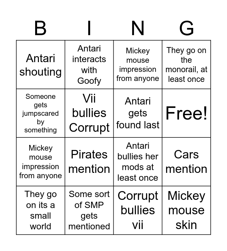 This bingo card has 37 words: Antari crashout, Pirates mention, Antari gets found first, Antari gets found last, Antari goes on a ride, Antari goes to space mountain, Free!, They interact with Goofy, Someone gets jumpscared by something, They go on a water ride, Cars mention, They go on the monorail, at least once, They go on its a small world, Corrupt bullies vii, Vii bullies Corrupt, Mickey mouse skin, They get a screenshot with Shep, Mickey mouse impression from anyone, Vii and Corrupt flirt (ew get a room/silly), Some sort of SMP gets mentioned, Antari shouting, Pirates mention, Antari gets found first, Antari gets found last, Antari goes on a ride, Antari goes to space mountain, Antari interacts with Goofy, Someone gets jumpscared by something, Antari goes on a water ride, Cars mention, Antari goes on the monorail, at least once, Antari goes on its a small world, Antari bullies her mods at least once, Mickey mouse skin spotted, Antari gets a screenshot with Shep, Mickey mouse impression from anyone and Some sort of SMP gets mentioned.
