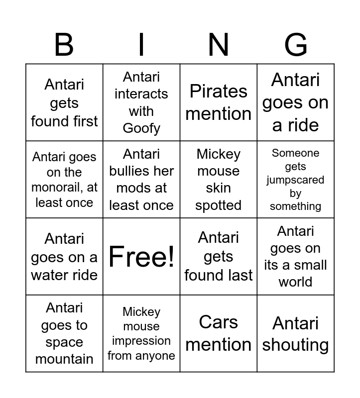 This bingo card has 18 words: Free!, Antari shouting, Pirates mention, Antari gets found first, Antari gets found last, Antari goes on a ride, Antari goes to space mountain, Antari interacts with Goofy, Someone gets jumpscared by something, Antari goes on a water ride, Cars mention, Antari goes on the monorail, at least once, Antari goes on its a small world, Antari bullies her mods at least once, Mickey mouse skin spotted, Antari gets a screenshot with Shep, Mickey mouse impression from anyone and Some sort of SMP gets mentioned.