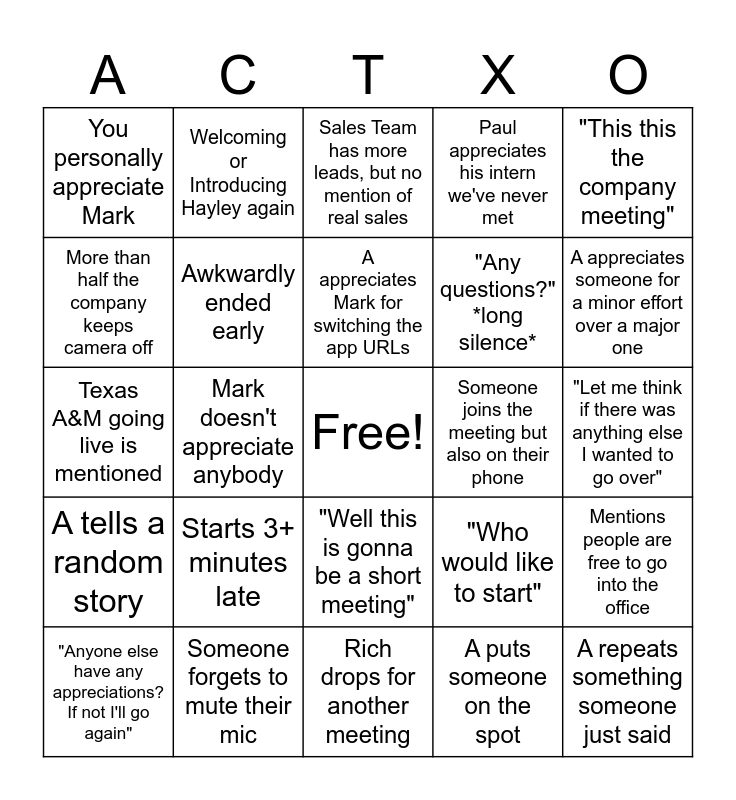 This bingo card has a free space and 24 words: Starts 3+ minutes late, Someone forgets to mute their mic, A appreciates Mark for switching the app URLs, "Anyone else have any appreciations? If not I'll go again", "This this the company meeting", You personally appreciate Mark, More than half the company keeps camera off, Welcoming or Introducing Hayley again, Someone joins the meeting but also on their phone, "Well this is gonna be a short meeting", "Any questions?" *long silence*, Texas A&M going live is mentioned, "Who would like to start", Mentions people are free to go into the office, Awkwardly ended early, A puts someone on the spot, "Let me think if there was anything else I wanted to go over", Sales Team has more leads, but no mention of real sales, A appreciates someone for a minor effort over a major one, Mark doesn't appreciate anybody, A repeats something someone just said, A tells a random story, Paul appreciates his intern we've never met and Rich drops for another meeting.