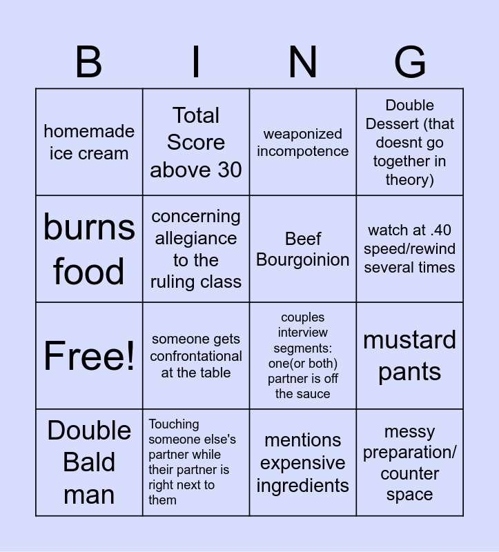 This bingo card has 55 words: New Dish (one we havent seen served yet), 'Hated x dish, but Loved this', "Did you make this?" "no", homemade ice cream, Uncomfortable musical performance, mentions meeting royalty, Beef Bourgoinion, Lamb Dish, Free!, Potato Dolphinose, Double Dessert (that doesnt go together in theory), Single Digit Score, "we had this dish on holiday so i recreated it", Floral Wallpaper, Bald man, Tied First Place, burns food, mustard pants, Bald by Choice, Double Bald man, Touching someone else's partner while their partner is right next to them, floral print jazzy shirt, 'never made dish before today', weaponized incompotence, poor knife handling, watch at .40 speed/rewind several times, military/wartime enthusiasts, Pictures of family in weird place, mentions expensive ingredients, asks inappropriate question(s), "___ is just opinionated/says how it is", Flower stained glass, second hand embarassment, hates spouse, concerning allegiance to the ruling class, couples interview segments: one(or both) partner is off the sauce, dropped cutlery, messy preparation/ counter space, tiny fireplace, Gaudy wallpaper, Total Score above 30, Charlton learns something new about the UK, Someone does a bad impression/accent, Blonde European wife, Charlton Pauses to Rant, Throbbing man crush, Forgets guest's name(s), Joke doesnt land (followed by seconds of silence), Narrator makes pun, someone gets confrontational at the table, speed bump in taxi drive home, Inappropriate dinner discussion topic, objectively and subjectively bad tattoo, man acts like baby, tries to be funny "eccentric" and Duck Breast.