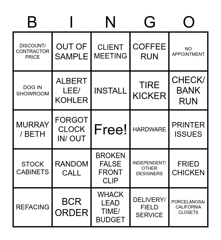 This bingo card has a free space and 24 words: RANDOM CALL, BCR ORDER, INSTALL, REFACING, NO APPOINTMENT, DISCOUNT/ CONTRACTOR PRICE, DOG IN SHOWROOM, OUT OF SAMPLE, HARDWARE, BROKEN FALSE FRONT CLIP, TIRE KICKER, MURRAY / BETH, INDEPENDENT/ OTHER DESIGNERS, FRIED CHICKEN, ALBERT LEE/ KOHLER, DELIVERY/ FIELD SERVICE, PRINTER ISSUES, CLIENT MEETING, CHECK/ BANK RUN, FORGOT CLOCK IN/ OUT, PORCELANOSA/ CALIFORNIA CLOSETS, STOCK CABINETS, COFFEE RUN and WHACK LEAD TIME/ BUDGET.