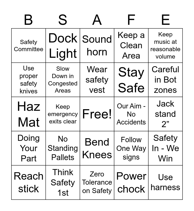 This bingo card has a free space and 76 words: Proper lifting, Pre-Inspection Checklist, Sound horn, Stop at intersections, 2 bay rule, Be aware of surroundings, Clean as you go, Stretch before work, Get 7-8 hours of sleep, Stay hydrated, Wear protective footwear, Use protective gloves, Wear safety vest, Use proper safety knives, Dock Safety System, Keep emergency exits clear, Report safety incidents timely, Use harness, Tier picking, Keep music at reasonable volume, 5S Work area, Haz Mat, Slow Down in Congested Areas, Dock Light, Keep a Clean Area, Throw away label backings, Don’t step on pallets, Careful with OP Gate, Do not enter racks, Avoid backing out of aisles, Use good pallets, Report all Hazards, Slow down entering dock, Follow One Way signs, Careful in Bot zones, Stay Safe, Go Home Same way you came, No Shortcuts with Safety, Jack stand 2”, Power chock, Glad lock, Flag Cone, Walkie rider 4 point stance, PIT license, Pedestrian walkway, Totes 15 high, Reach stick, Safety Committee, Risky Business, Lock Out Tag Out, Lifting Zone, Bend Knees, Don’t over extend, Don’t twist your body, Steel toe shoes, Stay 5’ from Pedestrians, Follow the Rules, Safety Suggestion Box, Share Concerns, MSDS, No Standing Pallets, OSHA/DOT, A Safer You is a Safer Me, Accidents Hurt - Safety Doesn't, Be Sure Be Safe, Make Safety a Priority, Our Aim - No Accidents, Risk - Is It Worth It?, Safe and Healthy!, Safe to Do? Ask, Safety In - We Win, Doing Your Part, Think Safety 1st, Work Together - Work Safely, Zero Tolerance on Safety and Safety is You..
