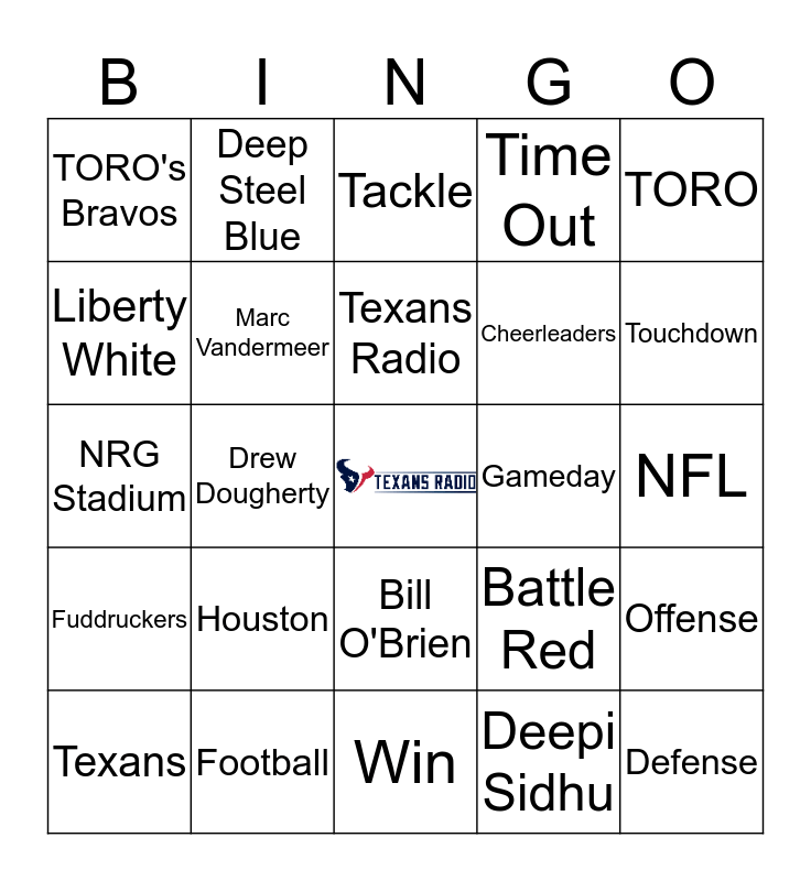 This bingo card has a free space and 24 words: Houston, Football, Texans Radio, Texans, TORO, TORO's Bravos, Liberty White, Deep Steel Blue, Gameday, Bill O'Brien, Cheerleaders, NRG Stadium, Battle Red, Offense, Marc Vandermeer, Deepi Sidhu, NFL, Tackle, Touchdown, Drew Dougherty, Defense, Fuddruckers, Time Out and Win.