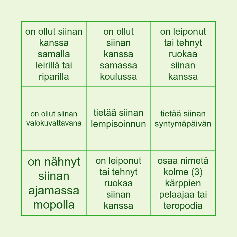 This bingo card has a free space and 9 words: on nähnyt siinan ajamassa mopolla, on leiponut tai tehnyt ruokaa siinan kanssa, on ollut siinan kanssa samassa koulussa, on ollut siinan valokuvattavana, on ollut siinan kanssa samalla leirillä tai riparilla, tietää siinan syntymäpäivän, osaa nimetä kolme (3) kärppien pelaajaa tai teropodia, on joutunut siinan hyvän yön puhelun uhriksi and on leiponut tai tehnyt ruokaa siinan kanssa.