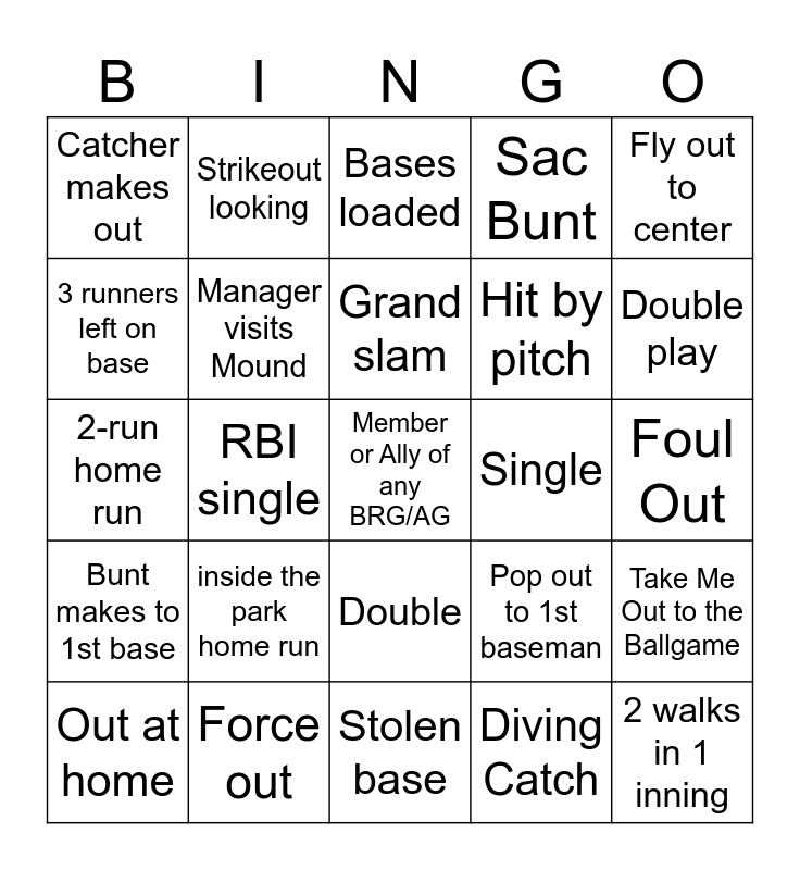 This bingo card has a free space and 24 words: inside the park home run, Force out, Grand slam, Out at home, Fly out to center, Catcher makes out, 3 runners left on base, Strikeout looking, Single, Double, Hit by pitch, 2-run home run, Pop out to 1st baseman, Take Me Out to the Ballgame, Manager visits Mound, Diving Catch, Foul Out, Bases loaded, Double play, RBI single, 2 walks in 1 inning, Bunt makes to 1st base, Sac Bunt and Stolen base.