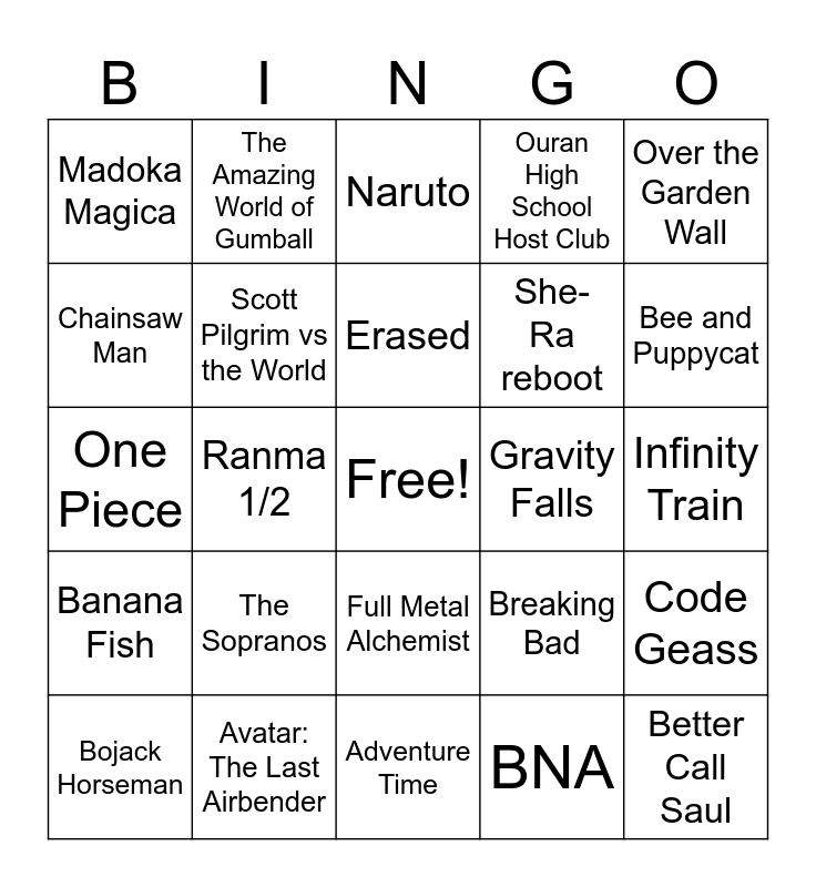 This bingo card has a free space and 24 words: The Sopranos, Avatar: The Last Airbender, Erased, Bojack Horseman, Over the Garden Wall, Madoka Magica, Chainsaw Man, The Amazing World of Gumball, Gravity Falls, Full Metal Alchemist, She-Ra reboot, One Piece, Breaking Bad, Code Geass, Scott Pilgrim vs the World, BNA, Infinity Train, Naruto, Bee and Puppycat, Ranma 1/2, Better Call Saul, Banana Fish, Ouran High School Host Club and Adventure Time.