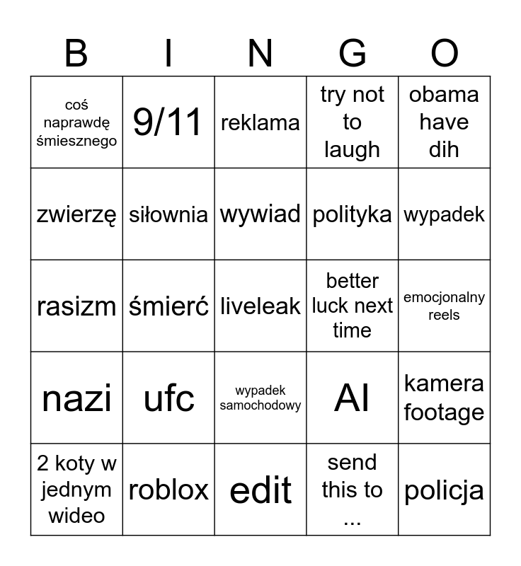 This bingo card has 25 words: ufc, edit, wywiad, 2 koty w jednym wideo, obama have dih, coś naprawdę śmiesznego, zwierzę, 9/11, better luck next time, wypadek samochodowy, polityka, rasizm, AI, kamera footage, siłownia, policja, emocjonalny reels, reklama, wypadek, śmierć, liveleak, roblox, nazi, try not to laugh and send this to ....