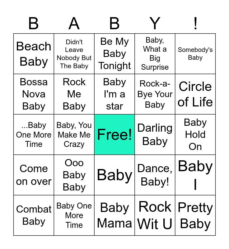 This bingo card has a free space and 89 words: ABC, Always Be My Baby, Baby, B-A-B-Y, Baby, Baby, Baby, Baby Be Mine, Baby Boy, Baby Come Back, Baby Come Back to Me, Baby Don't Lie, Baby Driver, Baby Got Back, Baby I, Baby Hold On, Baby, I Love You, Baby I'm a star, Baby I'm Yours, Baby I Need Your Loving, Baby It's You, Baby I Won't, Baby, Let's Play House, Baby Love, Baby Mama, Baby Now that I've Found You, ...Baby One More Time, Baby One More Time, Baby, Please Don't Go, Baby Powder, Baby Says, Baby Shark, Baby, What a Big Surprise, Baby, You Make Me Crazy, Baby, You're a Rich Man, Beach Baby, Be My Baby, Be My Baby Tonight, Bossa Nova Baby, Can't Get Enough of You Baby, Circle of Life, Combat Baby, Come on over, Comin' Home Baby, Cry Baby, Cry Baby Cry, Dance, Baby!, Darling Baby, Daughter, Daughters, Dayum, Baby, Didn't Leave Nobody But The Baby, Don't Worry Baby, Girls That Dance, Give It To Me Baby, Here Comes My Baby, Hey Baby, Ice Ice Baby, ily, I'm Your Baby Tonight, Industry Baby, Magic Dance, Million Dollar Baby, Missing My Baby, My Baby, My Baby Just Cares For Me, My Girl, Never Grow UP, No More, Ohh Baby, One For My Baby, Ooo Baby Baby, Pretty Baby, Pretty Little Baby, Real Love Baby, Rock-a-Bye Your Baby, Rock Me Baby, Rock Wit U, Runaway Baby, Run Baby Run, Scorsese Baby Daddy, Since I Love My Baby, Somebody's Baby, Someone Else Calling Your My Baby, Steppin' Out With My Baby, Take Good Care OF My Baby, There Goes MY Baby, Too Busy Thinking About My Baby, You'll Be In My Heart, Having My Baby and You're Just a Baby.