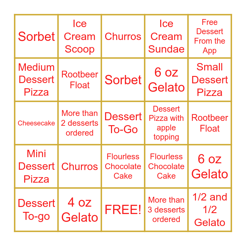 This bingo card has 25 words: Mini Dessert Pizza, 4 oz Gelato, Dessert To-Go, More than 3 desserts ordered, Free Dessert From the App, Sorbet, Ice Cream Scoop, Churros, Dessert Pizza with apple topping, 6 oz Gelato, Medium Dessert Pizza, Rootbeer Float, FREE!, Flourless Chocolate Cake, Small Dessert Pizza, Dessert To-go, More than 2 desserts ordered, Sorbet, 6 oz Gelato, Rootbeer Float, Cheesecake, Churros, Flourless Chocolate Cake, Ice Cream Sundae and 1/2 and 1/2 Gelato.
