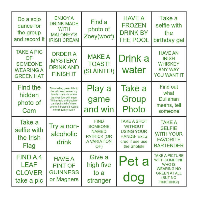 This bingo card has a free space and 29 words: CHUG A FULL GLASS OF WATER IN UNDER 10 SECONDS (SET TIMER), HAVE A PINT OF GUINNESS or Magners, Find a photo of Zoey(woof), TAKE A PICTURE OF A LEPRECHAUN, Take a selfie with the birthday gal, Do a solo dance for the group and record it, ORDER A MYSTERY DRINK AND FINISH IT, MAKE A TOAST! (SLÁINTE!), Take a Group Photo, TAKE A SELFIE WITH YOUR FAVORITE BARTENDER, FIND A 4 LEAF CLOVER take a pic, From rolling green hills to the wild sea breeze, my family home's is where the river flow with ease. With music and laughter , and pubs full of cheer, where in Ireland is Cam's mom's family near?, Pet a dog, TAKE A PICTURE WITH SOMEONE WHO IS WEARING NO GREEN AT ALL (BUT NO PINCHING!), Find the hidden photo of Cam, ORDER AND EAT AN IRISH DISH, Give a high five to a stranger, TAKE A SHOT WITHOUT USING YOUR HANDS- Extra cred if use use the Shotski, HAVE AN IRISH WHISKEY ANY WAY YOU WANT IT, Take a selfie with the Irish Flag, Try a non-alcoholic drink, Do an Irish Jig for the group, Drink a water, Find out what Dullahan means, tell someone, TAKE A PIC OF SOMEONE WEARING A GREEN HAT, ENJOY A DRINK MADE WITH MALONEY'S IRISH CREAM, FIND SOMEONE NAMED PATRICK (OR A VARIATION OF), HAVE A FROZEN DRINK BY THE POOL and TAKE A PICTURE OF SOMEONE WITH AN IRISH TATTOO.