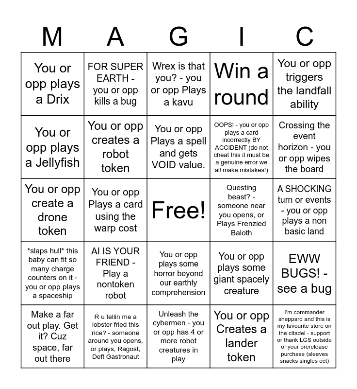 This bingo card has a free space and 32 words: You or opp Creates a lander token, You or opp searches their library, You or opp Plays a card using the warp cost, You or opp puts a +1/+1 counter on a creature., *slaps hull* this baby can fit so many charge counters on it - you or opp plays a spaceship, You or opp creates a robot token, You or opp triggers the landfall ability, EWW BUGS! - see a bug, FOR SUPER EARTH - you or opp kills a bug, HE'S on my 6 - you or opp blows up a spaceship, You or opp Plays a spell and gets VOID value., Wrex is that you? - you or opp Plays a kavu, DOG, Normie - Play a human, Questing beast? - someone near you opens, or Plays Frenzied Baloth, I come in peace - don't kill opp creatures or attack them for the First 4 turns, Make a far out play. Get it? Cuz space, far out there, You or opp create a drone token, You or opp plays some horror beyond our earthly comprehension, AI IS YOUR FRIEND - Play a nontoken robot, You or opp plays some giant spacely creature, Stronk - you or opp has 10 or more +1 counters on a permanent, A SHOCKING turn or events - you or opp plays a non basic land, R u tellin me a lobster fried this rice? - someone around you opens, or plays, Ragost, Deft Gastronaut, I’m commander sheppard and this is my favourite store on the citadel - support or thank LGS outside of your prerelease purchase (sleeves snacks singles ect), Win a round, OOPS! - you or opp plays a card incorrectly BY ACCIDENT (do not cheat this it must be a genuine error we all make mistakes!), You or opp plays a Jellyfish, You or opp plays a Drix, Unleash the cybermen - you or opp has 4 or more robot creatures in play, Futurama crew - you and your opp collectively have a robot, lander or spacecraft, human, and non-human humanoid (drix, kavu, ect) creature on the field at the same time. and Crossing the event horizon - you or opp wipes the board.