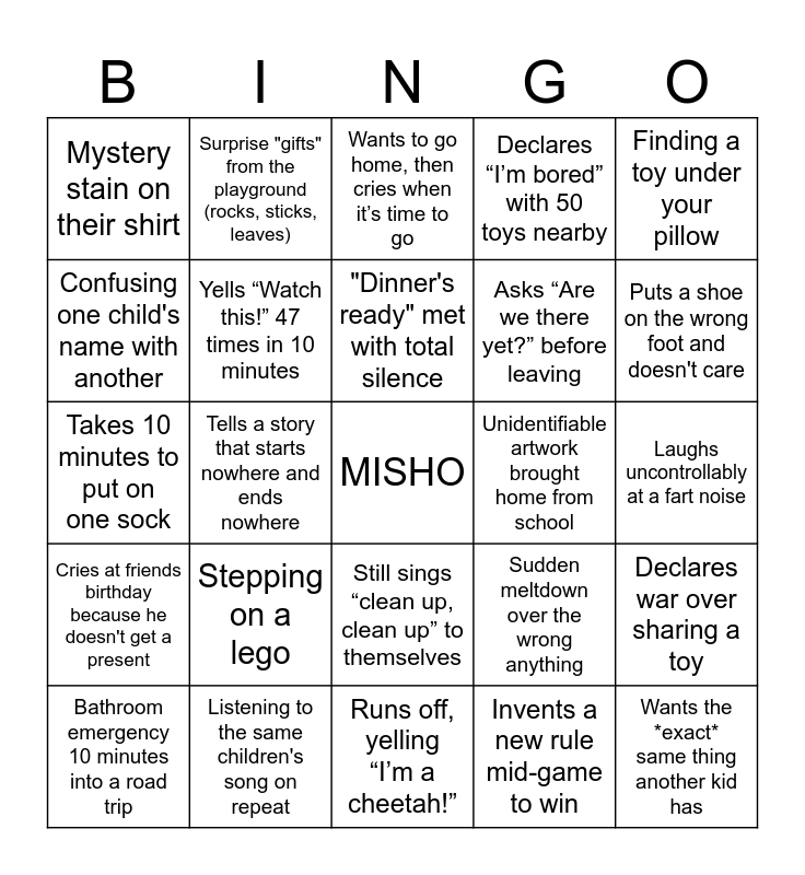 This bingo card has a free space and 24 words: Stepping on a lego, Listening to the same children's song on repeat, "Dinner's ready" met with total silence, Bathroom emergency 10 minutes into a road trip, Finding a toy under your pillow, Mystery stain on their shirt, Confusing one child's name with another, Surprise "gifts" from the playground (rocks, sticks, leaves), Unidentifiable artwork brought home from school, Still sings “clean up, clean up” to themselves, Asks “Are we there yet?” before leaving, Takes 10 minutes to put on one sock, Sudden meltdown over the wrong anything, Declares war over sharing a toy, Yells “Watch this!” 47 times in 10 minutes, Invents a new rule mid-game to win, Laughs uncontrollably at a fart noise, Wants to go home, then cries when it’s time to go, Puts a shoe on the wrong foot and doesn't care, Tells a story that starts nowhere and ends nowhere, Wants the *exact* same thing another kid has, Cries at friends birthday because he doesn't get a present, Declares “I’m bored” with 50 toys nearby and Runs off, yelling “I’m a cheetah!”.