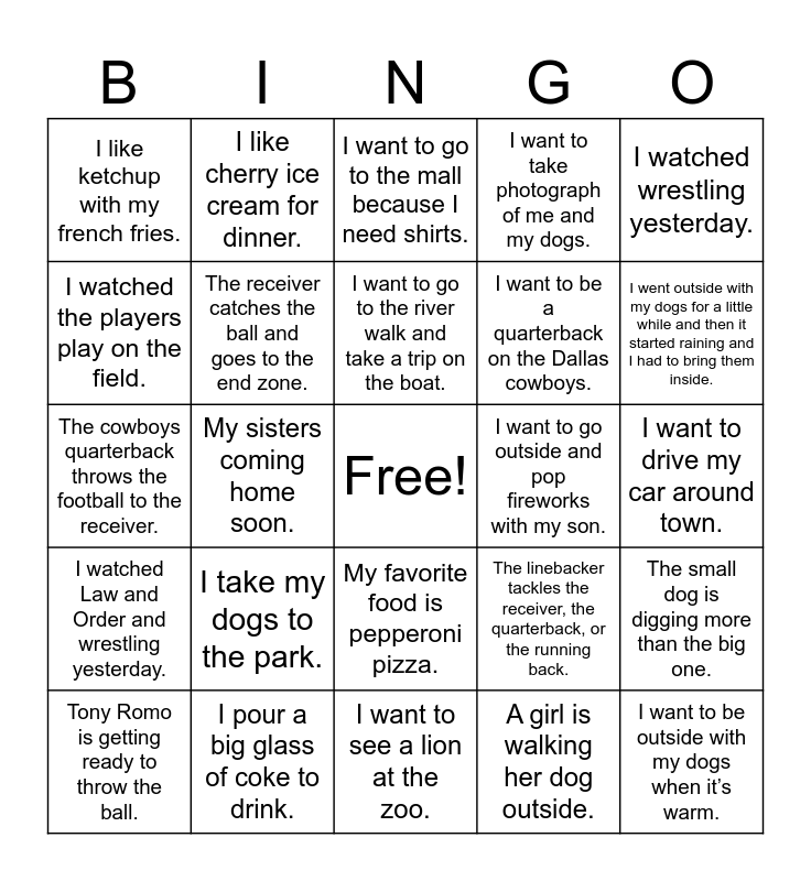 This bingo card has a free space and 24 words: Tony Romo is getting ready to throw the ball., I take my dogs to the park., I want to go to the river walk and take a trip on the boat., A girl is walking her dog outside., I watched wrestling yesterday., I like ketchup with my french fries., I like cherry ice cream for dinner., I want to go to the mall because I need shirts., I want to go outside and pop fireworks with my son., I want to drive my car around town., The cowboys quarterback throws the football to the receiver., The receiver catches the ball and goes to the end zone., The linebacker tackles the receiver, the quarterback, or the running back., The small dog is digging more than the big one., I watched the players play on the field., I pour a big glass of coke to drink., I want to see a lion at the zoo., I want to take photograph of me and my dogs., I went outside with my dogs for a little while and then it started raining and I had to bring them inside., I watched Law and Order and wrestling yesterday., My sisters coming home soon., My favorite food is pepperoni pizza., I want to be a quarterback on the Dallas cowboys. and I want to be outside with my dogs when it’s warm..