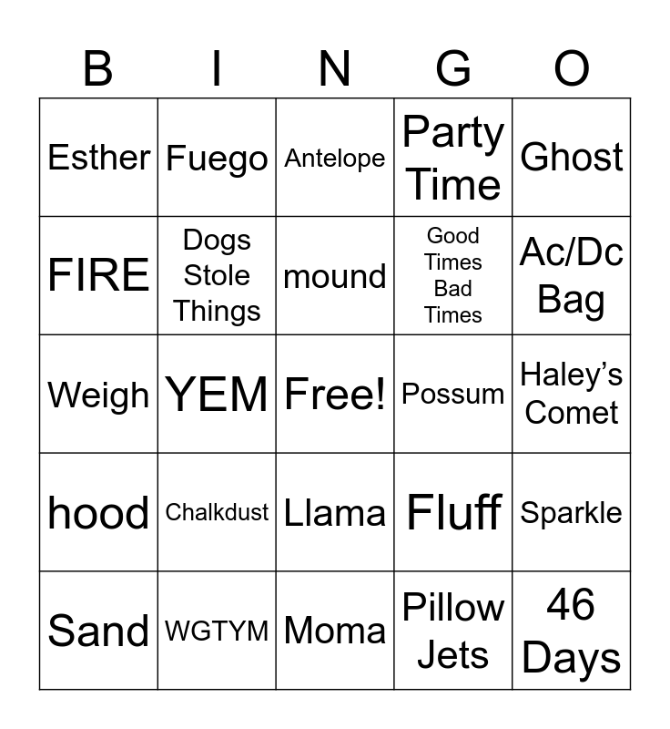 This bingo card has a free space and 24 words: Chalkdust, WGTYM, mound, Sand, Ghost, Esther, FIRE, Fuego, Possum, Llama, Good Times Bad Times, Weigh, Fluff, Sparkle, Dogs Stole Things, Pillow Jets, Haley’s Comet, Antelope, Ac/Dc Bag, YEM, 46 Days, hood, Party Time and Moma.