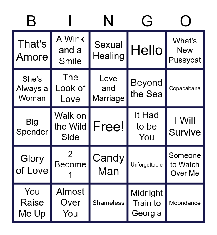 This bingo card has a free space and 24 words: 2 Become 1, Almost Over You, Love and Marriage, You Raise Me Up, What's New Pussycat, That's Amore, She's Always a Woman, A Wink and a Smile, It Had to be You, Candy Man, Beyond the Sea, Big Spender, Unforgettable, Someone to Watch Over Me, The Look of Love, Midnight Train to Georgia, I Will Survive, Sexual Healing, Copacabana, Walk on the Wild Side, Moondance, Glory of Love, Hello and Shameless.