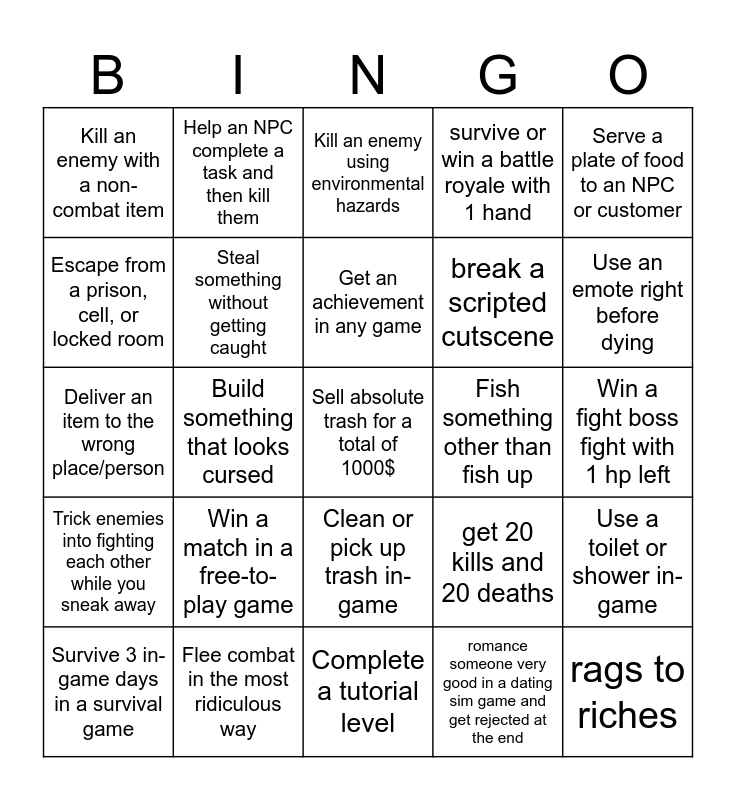 This bingo card has 25 words: Win a match in a free-to-play game, Complete a tutorial level, Get an achievement in any game, Survive 3 in-game days in a survival game, Serve a plate of food to an NPC or customer, Kill an enemy with a non-combat item, Escape from a prison, cell, or locked room, Help an NPC complete a task and then kill them, Fish something other than fish up, Clean or pick up trash in-game, break a scripted cutscene, Deliver an item to the wrong place/person, get 20 kills and 20 deaths, Use a toilet or shower in-game, Steal something without getting caught, rags to riches, Win a fight boss fight with 1 hp left, Kill an enemy using environmental hazards, Use an emote right before dying, Build something that looks cursed, Sell absolute trash for a total of 1000$, Flee combat in the most ridiculous way, Trick enemies into fighting each other while you sneak away, survive or win a battle royale with 1 hand and romance someone very good in a dating sim game and get rejected at the end.