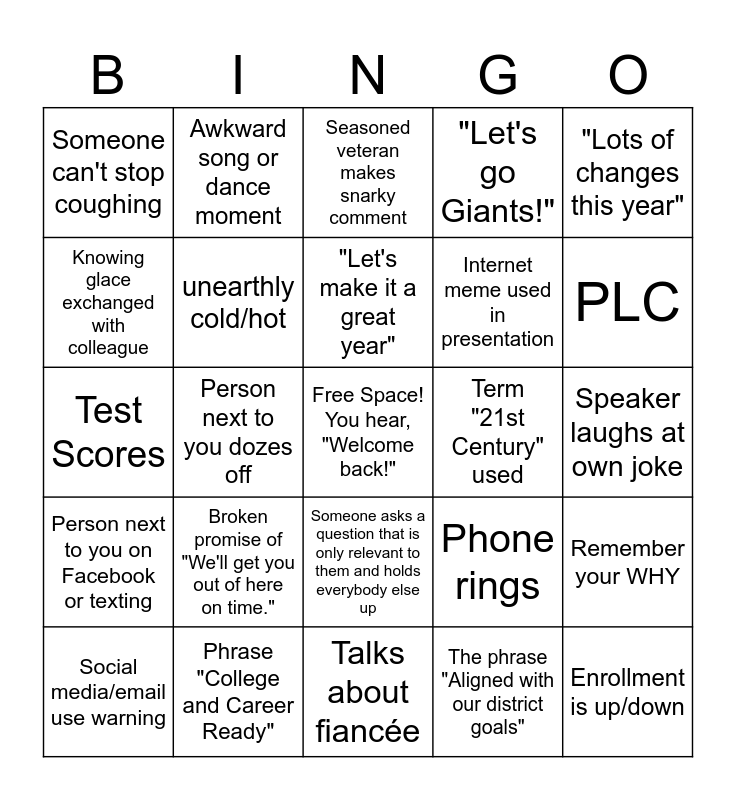 This bingo card has a free space and 29 words: Social media/email use warning, School safety updates, Person next to you dozes off, "Conversation", Someone can't stop coughing, Seasoned veteran makes snarky comment, unearthly cold/hot, Broken promise of "We'll get you out of here on time.", Term "21st Century" used, Phrase "College and Career Ready", Speaker laughs at own joke, Enrollment is up/down, Talks about fiancée, The phrase "Aligned with our district goals", PLC, You think "I really need to get work done in my room", Someone asks a question that is only relevant to them and holds everybody else up, Person next to you on Facebook or texting, "Lots of changes this year", Test Scores, Phone rings, Joke about summer weather, Internet meme used in presentation, Knowing glace exchanged with colleague, "Let's go Giants!", Awkward song or dance moment, Remember your WHY, "Let's make it a great year" and Someone asks a question that has clearly already been answered.