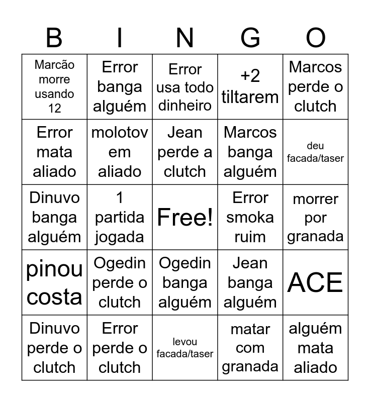 This bingo card has a free space and 24 words: Ogedin perde o clutch, Error perde o clutch, Jean perde a clutch, Dinuvo perde o clutch, Marcos perde o clutch, Marcão morre usando 12, Error mata aliado, Error banga alguém, Error smoka ruim, Ogedin banga alguém, Marcos banga alguém, Dinuvo banga alguém, Jean banga alguém, ACE, molotov em aliado, matar com granada, morrer por granada, Error usa todo dinheiro, deu facada/taser, 1 partida jogada, alguém mata aliado, pinou costa, +2 tiltarem and levou facada/taser.