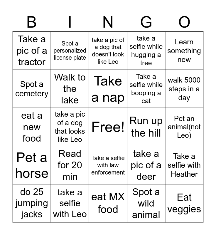 This bingo card has a free space and 24 words: Read for 20 min, take a selfie with Leo, Take a nap, do 25 jumping jacks, Learn something new, Take a pic of a tractor, Spot a cemetery, Spot a personalized license plate, Run up the hill, Take a selfie with law enforcement, Take a selfie while booping a cat, eat a new food, take a pic of a deer, Take a selfie with Heather, Walk to the lake, Spot a wild animal, Pet an animal(not Leo), take a pic of a dog that doesn't look like Leo, walk 5000 steps in a day, take a pic of a dog that looks like Leo, Eat veggies, Pet a horse, take a selfie while hugging a tree and eat MX food.
