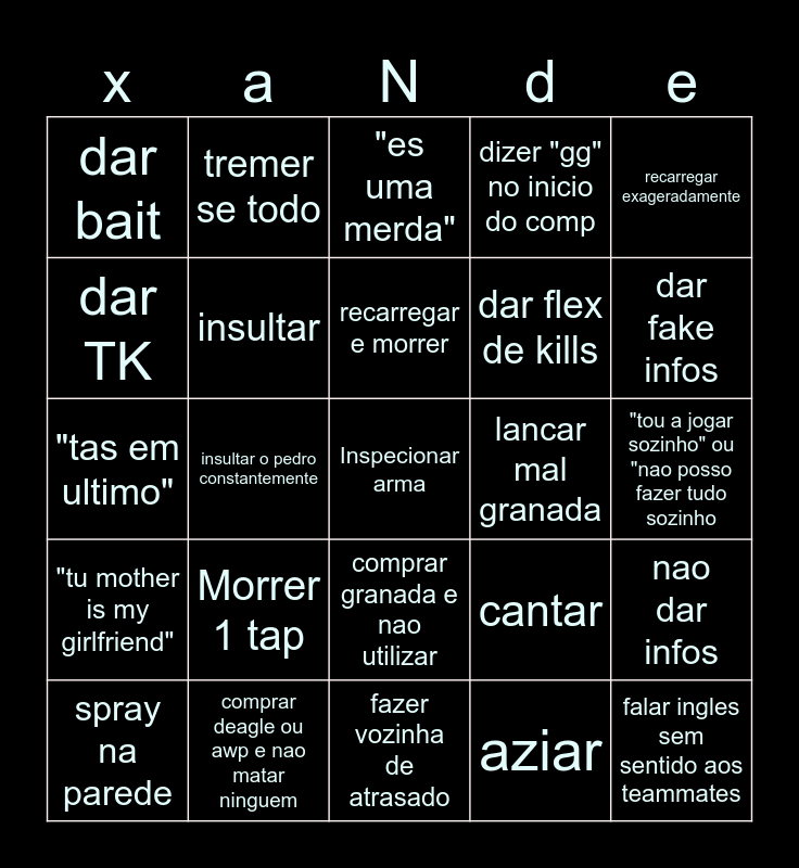 This bingo card has a free space and 24 words: Morrer 1 tap, comprar deagle ou awp e nao matar ninguem, recarregar e morrer, spray na parede, recarregar exageradamente, dar bait, dar TK, tremer se todo, lancar mal granada, comprar granada e nao utilizar, dar flex de kills, "tas em ultimo", cantar, nao dar infos, insultar, aziar, "tou a jogar sozinho" ou "nao posso fazer tudo sozinho, "es uma merda", dar fake infos, insultar o pedro constantemente, falar ingles sem sentido aos teammates, "tu mother is my girlfriend", dizer "gg" no inicio do comp and fazer vozinha de atrasado.