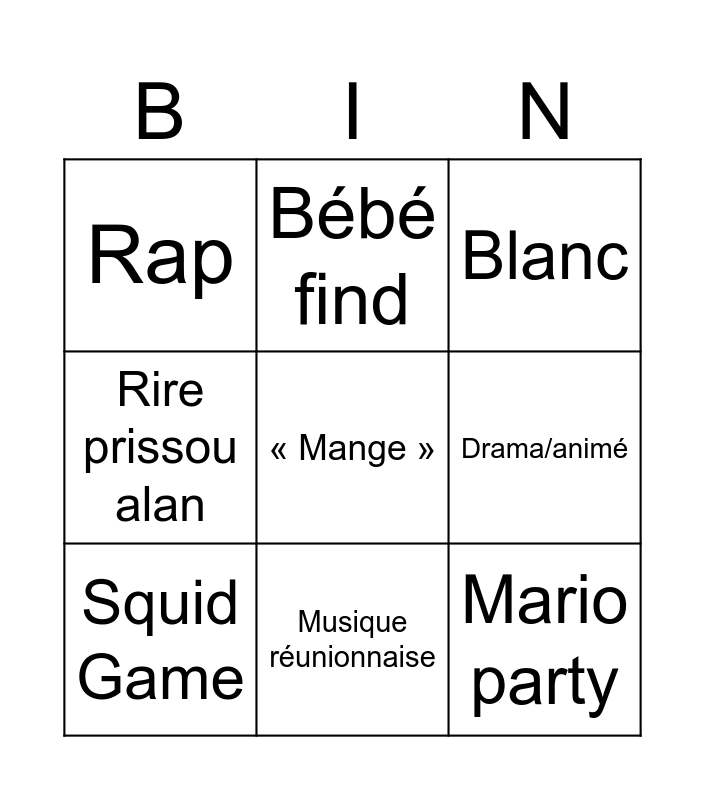 This bingo card has a free space and 8 words: Drama/animé, Blanc, Bébé find, Squid Game, Rap, Mario party, Rire prissou alan and Musique réunionnaise.