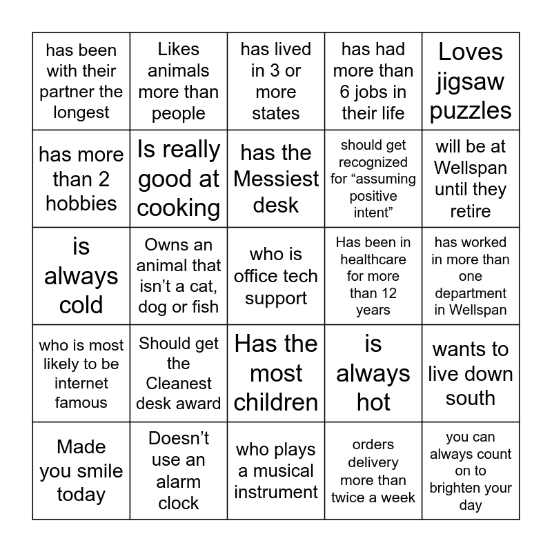 This bingo card has a free space and 24 words: Should get the Cleanest desk award, Doesn’t use an alarm clock, has the Messiest desk, Made you smile today, Loves jigsaw puzzles, has been with their partner the longest, has more than 2 hobbies, Likes animals more than people, Has been in healthcare for more than 12 years, Has the most children, should get recognized for “assuming positive intent”, is always cold, is always hot, wants to live down south, Is really good at cooking, orders delivery more than twice a week, has worked in more than one department in Wellspan, has lived in 3 or more states, will be at Wellspan until they retire, Owns an animal that isn’t a cat, dog or fish, you can always count on to brighten your day, who is most likely to be internet famous, has had more than 6 jobs in their life and who plays a musical instrument.