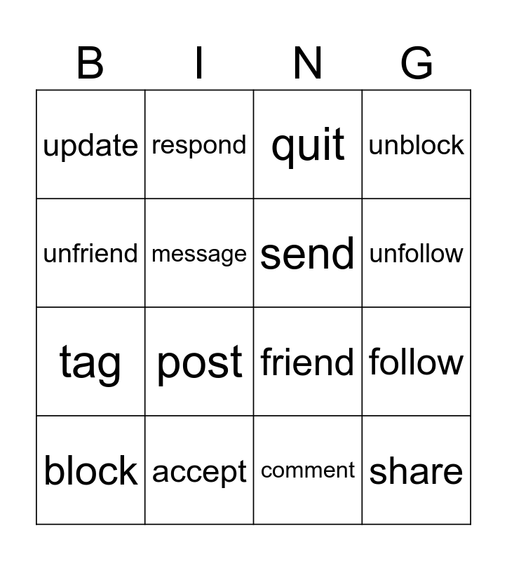 This bingo card has 16 words: accept, follow, quit, update, tag, respond, friend, comment, unfriend, message, block, unblock, post, unfollow, send and share.