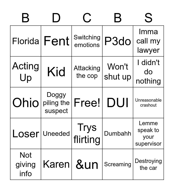 This bingo card has a free space and 24 words: Uneeded, Karen, Attacking the cop, Not giving info, Imma call my lawyer, Florida, Acting Up, Fent, DUI, Trys flirting, Won't shut up, Ohio, Dumbahh, Lemme speak to your supervisor, Kid, Screaming, Unreasonable crashout, Switching emotions, I didn't do nothing, Doggy piling the suspect, Destroying the car, Loser, P3do and &un.