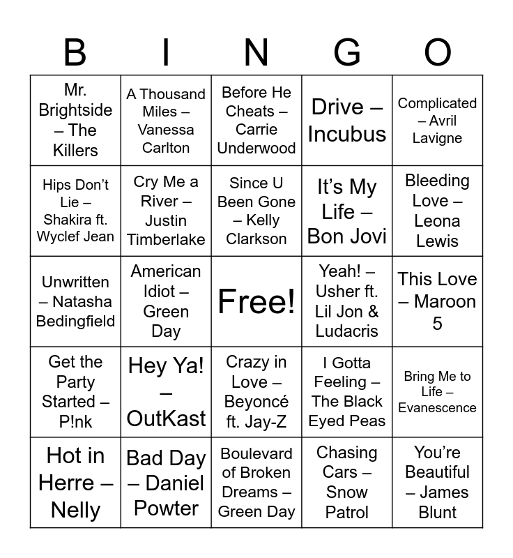 This bingo card has a free space and 25 words: Hey Ya! – OutKast, Boulevard of Broken Dreams – Green Day, Since U Been Gone – Kelly Clarkson, Hot in Herre – Nelly, Complicated – Avril Lavigne, Mr. Brightside – The Killers, Hips Don’t Lie – Shakira ft. Wyclef Jean, A Thousand Miles – Vanessa Carlton, Yeah! – Usher ft. Lil Jon & Ludacris, Crazy in Love – Beyoncé ft. Jay-Z, It’s My Life – Bon Jovi, Unwritten – Natasha Bedingfield, I Gotta Feeling – The Black Eyed Peas, Bring Me to Life – Evanescence, Cry Me a River – Justin Timberlake, In the End – Linkin Park, This Love – Maroon 5, Before He Cheats – Carrie Underwood, Bleeding Love – Leona Lewis, American Idiot – Green Day, You’re Beautiful – James Blunt, Bad Day – Daniel Powter, Get the Party Started – P!nk, Drive – Incubus and Chasing Cars – Snow Patrol.