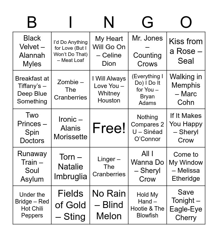 This bingo card has a free space and 25 words: Torn – Natalie Imbruglia, No Rain – Blind Melon, I Will Always Love You – Whitney Houston, Under the Bridge – Red Hot Chili Peppers, Kiss from a Rose – Seal, Black Velvet – Alannah Myles, Breakfast at Tiffany’s – Deep Blue Something, I’d Do Anything for Love (But I Won’t Do That) – Meat Loaf, Nothing Compares 2 U – Sinéad O’Connor, Linger – The Cranberries, (Everything I Do) I Do It for You – Bryan Adams, Two Princes – Spin Doctors, All I Wanna Do – Sheryl Crow, Come to My Window – Melissa Etheridge, Zombie – The Cranberries, One of Us – Joan Osborne, If It Makes You Happy – Sheryl Crow, My Heart Will Go On – Celine Dion, Walking in Memphis – Marc Cohn, Ironic – Alanis Morissette, Save Tonight – Eagle-Eye Cherry, Fields of Gold – Sting, Runaway Train – Soul Asylum, Mr. Jones – Counting Crows and Hold My Hand – Hootie & The Blowfish.