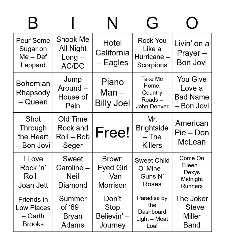 This bingo card has a free space and 25 words: Sweet Caroline – Neil Diamond, Don’t Stop Believin’ – Journey, Piano Man – Billy Joel, Friends in Low Places – Garth Brooks, Livin’ on a Prayer – Bon Jovi, Pour Some Sugar on Me – Def Leppard, Bohemian Rhapsody – Queen, Shook Me All Night Long – AC/DC, Mr. Brightside – The Killers, Brown Eyed Girl – Van Morrison, Take Me Home, Country Roads – John Denver, Shot Through the Heart – Bon Jovi, Sweet Child O’ Mine – Guns N’ Roses, Come On Eileen – Dexys Midnight Runners, Jump Around – House of Pain, Fat Bottomed Girls – Queen, American Pie – Don McLean, Hotel California – Eagles, You Give Love a Bad Name – Bon Jovi, Old Time Rock and Roll – Bob Seger, The Joker – Steve Miller Band, Summer of ‘69 – Bryan Adams, I Love Rock ’n’ Roll – Joan Jett, Rock You Like a Hurricane – Scorpions and Paradise by the Dashboard Light – Meat Loaf.