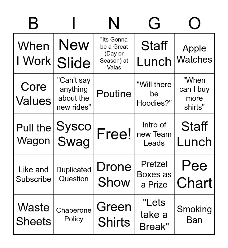 This bingo card has a free space and 29 words: Waste Sheets, Jewelry Policy, Sysco Swag, "Director of...", When I Work, "Its Gonna be a Great (Day or Season) at Valas, "Can't say anything about the new rides", Duplicated Question, Intro of new Team Leads, Chaperone Policy, Staff Lunch, Smoking Ban, Green Shirts, "Lets take a Break", "When can I buy more shirts", One Farm, One Team, Drone Show, Like and Subscribe, Apple Watches, Pull the Wagon, Pretzel Boxes as a Prize, Technology Issues, "Will there be Hoodies?", Core Values, Staff Lunch, New Slide, Pee Chart, Poutine and Staff Parking.