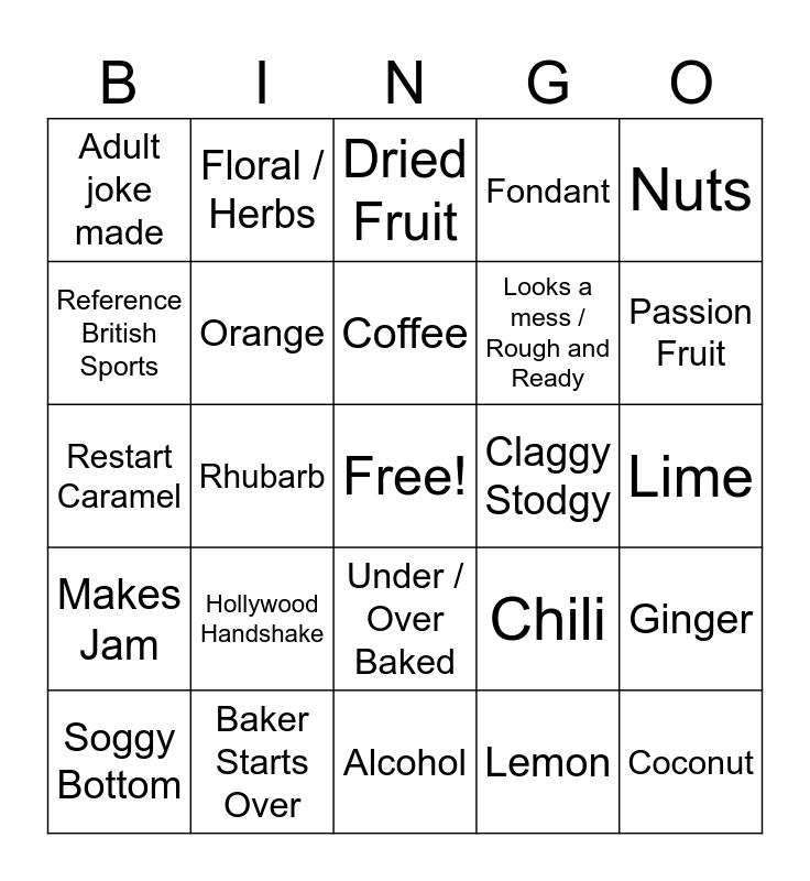 This bingo card has a free space and 24 words: Hollywood Handshake, Baker Starts Over, Coffee, Soggy Bottom, Nuts, Adult joke made, Reference British Sports, Floral / Herbs, Claggy Stodgy, Under / Over Baked, Looks a mess / Rough and Ready, Restart Caramel, Chili, Ginger, Orange, Lemon, Lime, Dried Fruit, Passion Fruit, Rhubarb, Coconut, Makes Jam, Fondant and Alcohol.