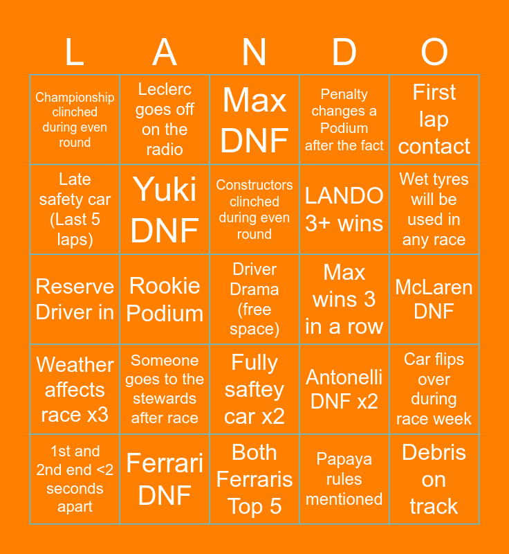 This bingo card has a free space and 40 words: Piastri Wins x3, Rookie Podium, Mercedes Podium, Max wins 3 in a row, Lewis missing Q3, 1st and 2nd end <2 seconds apart, Yuki DNF, Kick Top 5, LANDO 3+ wins, Car flips over during race week, Reserve Driver in, Leclerc goes off on the radio, Papaya rules mentioned, McLaren DNF, Weather affects race x3, Someone goes to the stewards after race, Grid penalty of 3 or more, Penalty changes a Podium after the fact, McLaren 1, 2, Championship clinched during even round, Ferrari DNF, Constructors clinched during even round, Antonelli DNF x2, Wet tyres will be used in any race, Double Williams Points, Sainz missing Q2 x2, Both Ferraris Top 5, Team orders ignored, Mercedes DNF, Track limit penalty, Piastri 3+ wins, Max DNF, Sainz making Q3, Debris on track, Late safety car (Last 5 laps), Double Aston Points, Fully saftey car x2, Same team collision, First lap contact and Driver Drama (Free Space).