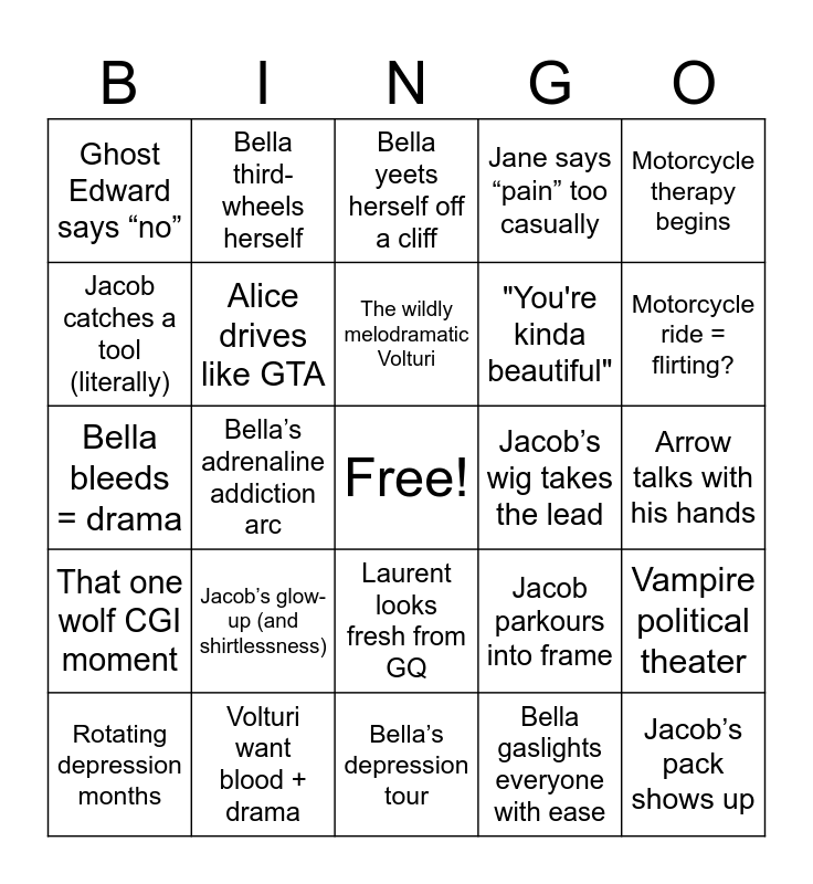 This bingo card has a free space and 25 words: Jacob’s glow-up (and shirtlessness), Bella’s depression tour, The wildly melodramatic Volturi, Rotating depression months, Motorcycle therapy begins, Ghost Edward says “no”, Jacob catches a tool (literally), Bella third-wheels herself, Jacob’s wig takes the lead, Laurent looks fresh from GQ, "You're kinda beautiful", Bella bleeds = drama, Jacob parkours into frame, Vampire political theater, Alice drives like GTA, “She’s not dead?” gasp, Arrow talks with his hands, Bella yeets herself off a cliff, Motorcycle ride = flirting?, Bella’s adrenaline addiction arc, Jacob’s pack shows up, Volturi want blood + drama, That one wolf CGI moment, Jane says “pain” too casually and Bella gaslights everyone with ease.