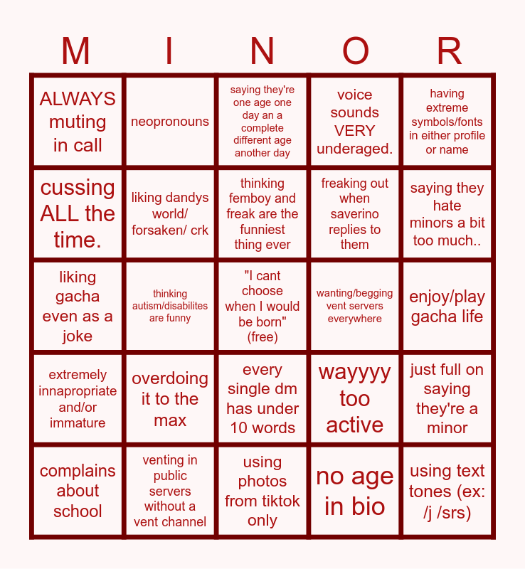 This bingo card has a free space and 34 words: rp'ing/acting only like a certain character, no age in bio, saying weird things to shock others, spamming unfunny photos, extremely innapropriate and/or immature, liking dandys world/ forsaken/ crk, having extreme symbols/fonts in either profile or name, complains about school, neopronouns, say "shart" or other words to replace cussing, thinking femboy and freak are the funniest thing ever, saying they're one age one day an a complete different age another day, e-dating, ragebaiting and leaving and rejoining servers, wanting/begging vent servers everywhere, saying they hate minors a bit too much.., venting in public servers without a vent channel, liking gacha even as a joke, overdoing it to the max, wayyyy too active, every single dm has under 10 words, using emojis in almost every text, ALWAYS muting in call, enjoy/play gacha life, using photos from tiktok only, using text tones (ex: /j /srs), voice sounds VERY underaged., begging for nitro, freaking out when saverino replies to them, cussing ALL the time., getting so excited over a saverino picture, thinking autism/disabilites are funny, just full on saying they're a minor and excusing a known minor because they're funny.