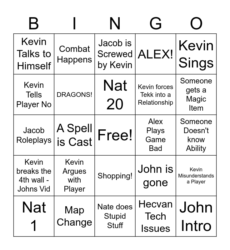 This bingo card has a free space and 24 words: Kevin Argues with Player, Map Change, Nat 20, Nat 1, Kevin Sings, Kevin Talks to Himself, Kevin Tells Player No, Combat Happens, Alex Plays Game Bad, Shopping!, Kevin forces Tekk into a Relationship, Jacob Roleplays, John is gone, Kevin Misunderstands a Player, DRAGONS!, Hecvan Tech Issues, Someone Doesn't know Ability, Jacob is Screwed by Kevin, Someone gets a Magic Item, A Spell is Cast, John Intro, Kevin breaks the 4th wall - Johns Vid, ALEX! and Nate does Stupid Stuff.