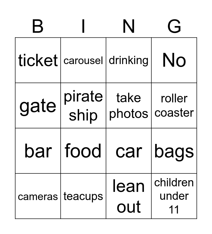 This bingo card has 24 words: Free!, ticket booth, roller coaster, seat belt, gate, ticket, pirate ship, carousel, teacups, haunted house, bar, car, stand up, cut in line, take photos, push, lean out, drinking, food, bags, cameras, children under 11, No and Don't.