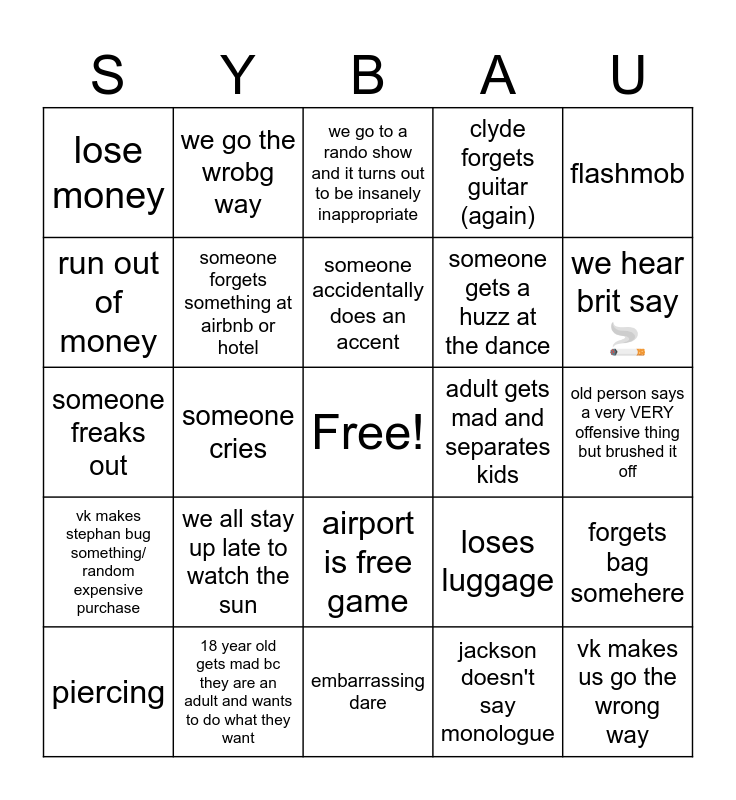 This bingo card has a free space and 24 words: we all stay up late to watch the sun, 18 year old gets mad bc they are an adult and wants to do what they want, someone accidentally does an accent, piercing, flashmob, lose money, run out of money, we go the wrobg way, adult gets mad and separates kids, airport is free game, someone gets a huzz at the dance, someone freaks out, loses luggage, forgets bag somehere, someone forgets something at airbnb or hotel, jackson doesn't say monologue, old person says a very VERY offensive thing but brushed it off, we go to a rando show and it turns out to be insanely inappropriate, we hear brit say 🚬, someone cries, vk makes us go the wrong way, vk makes stephan bug something/ random expensive purchase, clyde forgets guitar (again) and embarrassing dare.