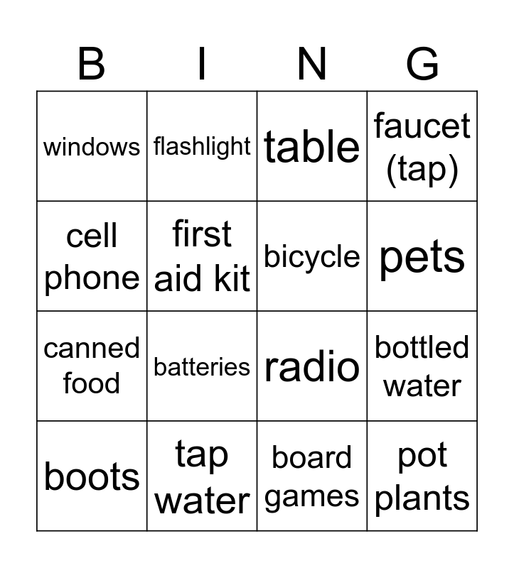 This bingo card has 16 words: tap water, bottled water, table, windows, canned food, flashlight, radio, board games, cell phone, first aid kit, boots, faucet (tap), batteries, pets, bicycle and pot plants.